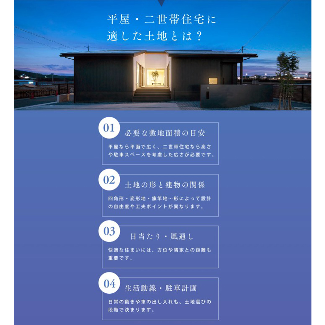 家族構成・ライフスタイル・将来の暮らし方をお伺いし、平屋・2世帯住宅に適した候補地をご紹介いたします。