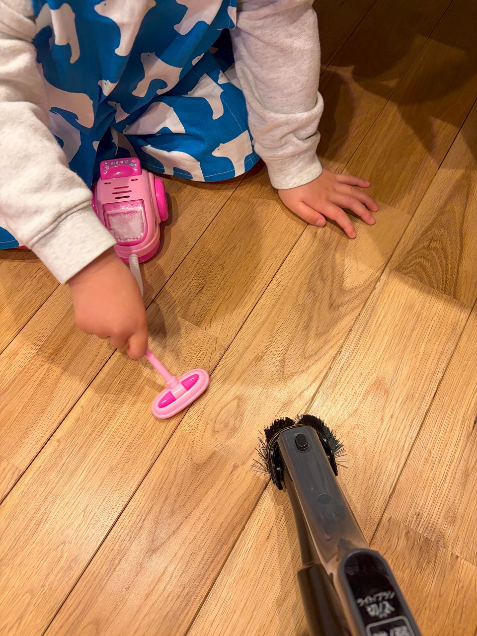 娘も自分の掃除機でお手伝い♪(全くゴミを吸っていません。)