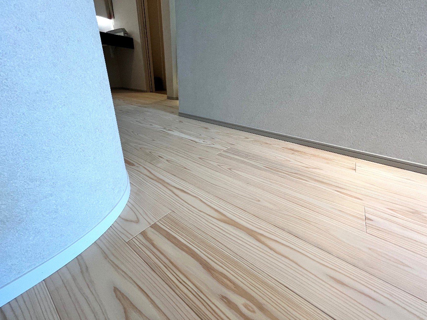 杉はやわらかな質感が特長のため、あえてスリッパを使用せず、素足のままでその心地よさをご体感いただけるようにしています。