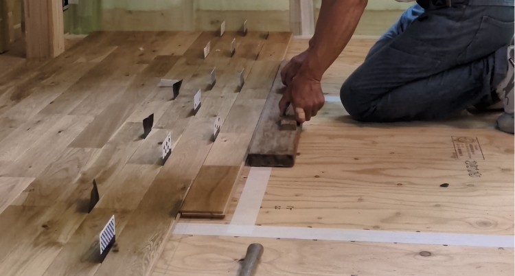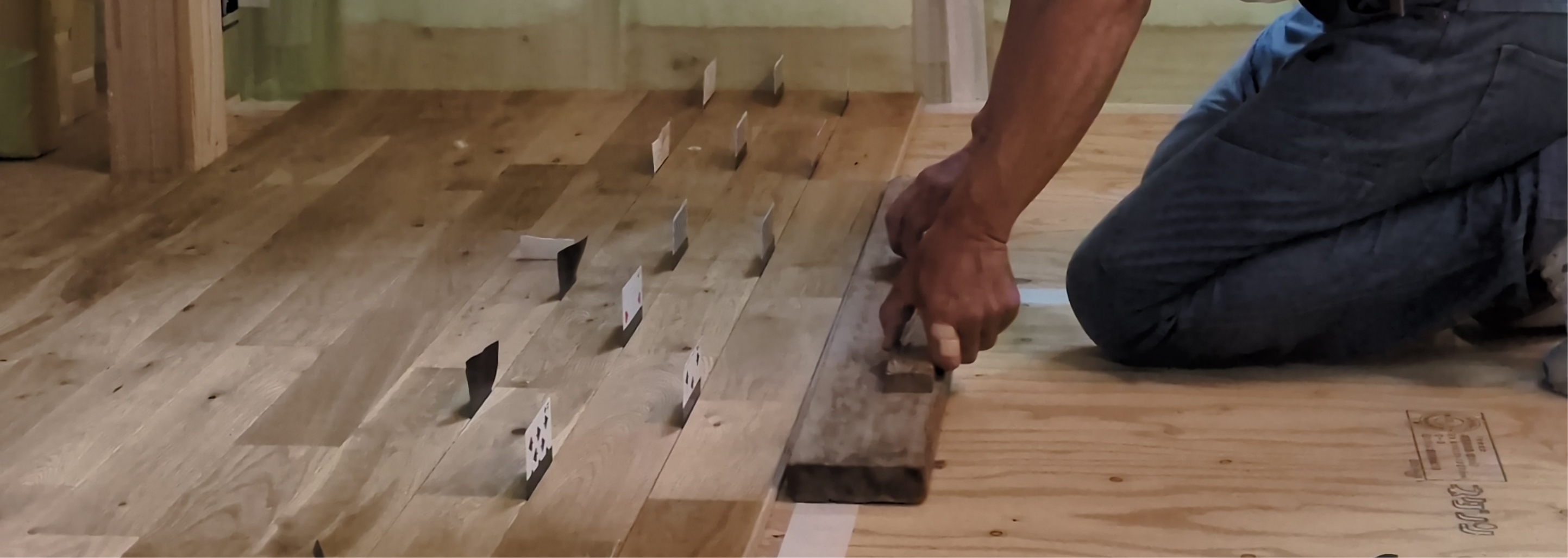 無垢材はその日の温湿度、無垢材の状態を考慮して、室内に並べ数日後に施工するなど施工手順を変えます。これは素材を室内の湿度に順応させるたり、色味の濃淡をバランス良く床に配置するためです。