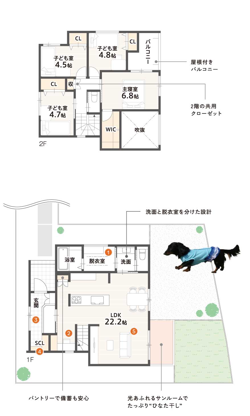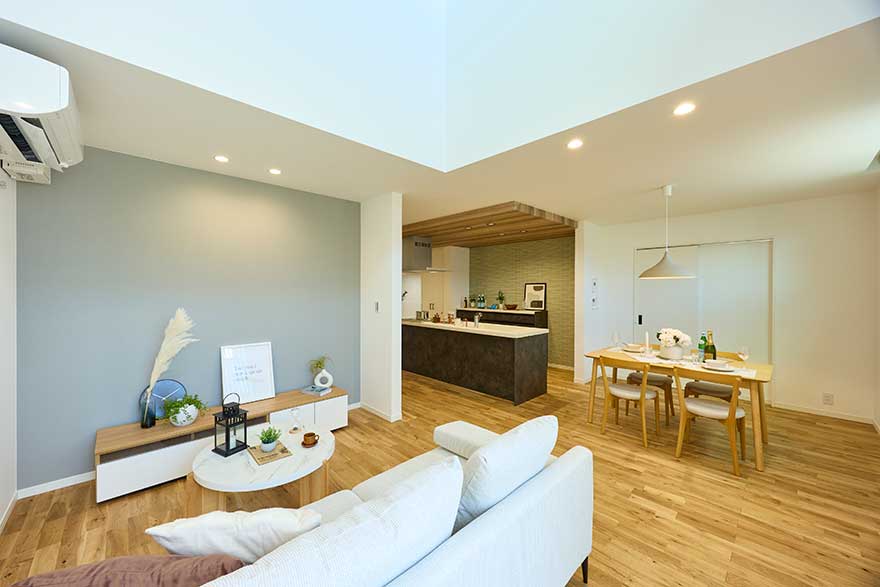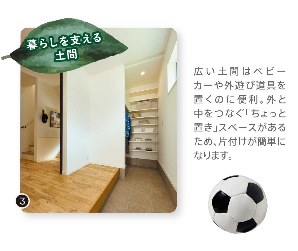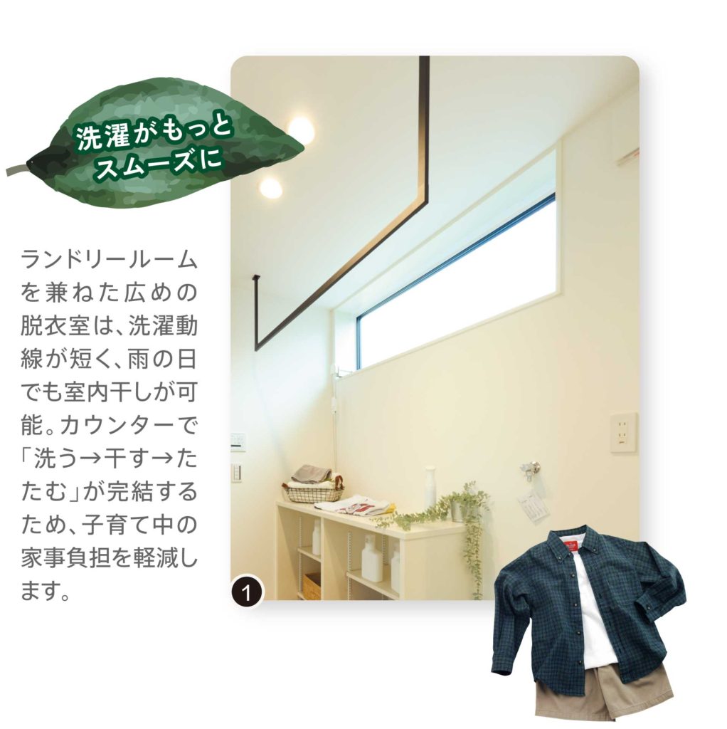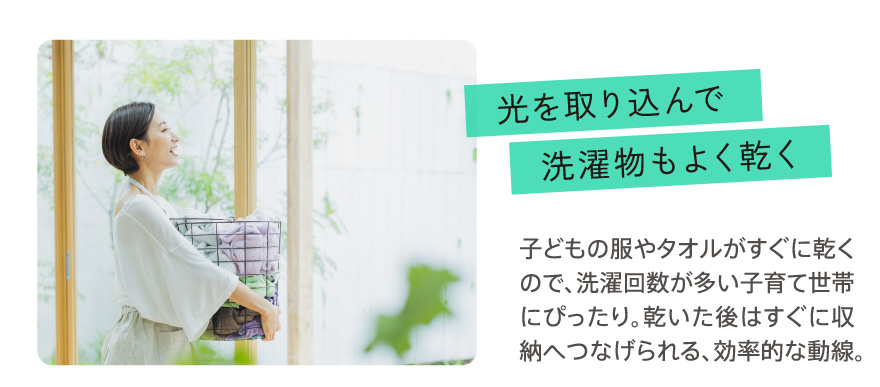 効率的な家事動線で時短が叶い、空いた時間を⼦どもと遊ぶ・⼀緒に学ぶ・家族でくつろぐ時間に。「毎⽇の洗濯がラクになること」が、そのまま「家族の笑顔と時間のゆとり」につながる住まい。